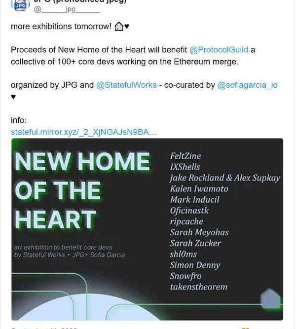 NewHomeoftheHeart是一个庆祝以太坊合并的NFT展览和销售,由StatefulWorks、JPG和SofíaGarcía共同策划。该项目的任何收益都将分配给以太坊核心开发者和参与的艺术家。为展览贡献作品的艺术家包括SarahZucker、Shl0ms、Snowfro等。