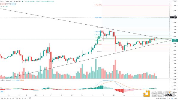 延续三角收敛,等待后续变盘,压力4.5美金,支撑3.7美金。