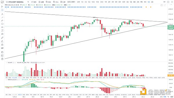 外围并无明显利空,BTC夜间大幅回落,主要还是前期日线背离和周五合约期权到期引发的,目前下探最低刚好触碰日线支撑趋势线,一旦放量跌破,后续调整力度将会加大,下一较强支撑区域在48000美金附近,目前日线MACD指标线还是死叉姿态,所以现在还是三角末端整理的姿态,上方压制线为历史顶点回落趋势线,后续BTC将会选择方向迎来短线变盘,下方趋势线目前支撑52500美金,上方压制58300美金,跌破上行趋势线并不意味牛市行情的结束,意味着市场在这一带震荡整理的时间加长,目前并未出现牛市见顶的迹象,前期中长线大方向已经多次分析过,根据前几轮牛市特征按目前顶点算,有效跌破4万美金一带支撑,这轮牛市才有结束的可能,跌破也会有超跌反弹逢高减仓的机会,目前还不需要过分担心,大方向仍是多头趋势,短线可以等三角变盘出方向。