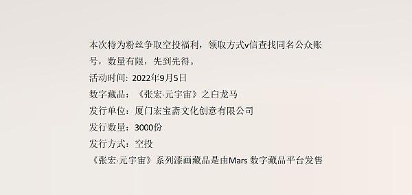 Mars平台与宏宝斋共同发行的数字藏品《张宏·元宇宙》之白龙马,将于9月5日正式发售,敬请期待。
