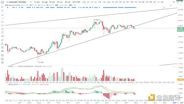 价格破位趋势线支撑,不过并未放量,整体还是区间盘整,关键趋势支撑在23.3美金附近,不破后续就还有向上的机会。