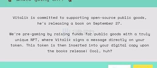 「V神新书将于9月27日出版。Gitcoin正通过一个真正独特的NFT为公共物品筹集资金,Vitalik直接在上面电子签名。图书发行后,此Token将插入您的数字副本中!酷吧?」