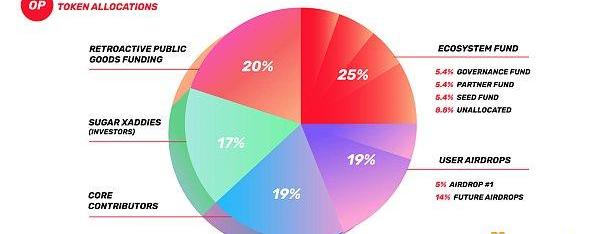 未来的空投将占另外14%的代币供应量,分配情况见下面的饼图。虽然未来空投的资格标准还不清楚,但你可以在Optimism上通过桥充值ETH并经常使用不同的去中心化应用程序,以获得更高的机会来获得下一个用户分配。