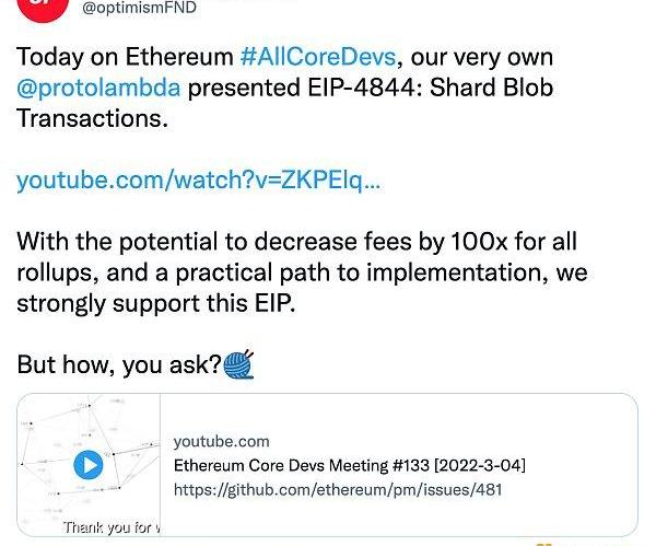 今天在以太坊#AllCoreDevs,我们自己的@protolambda介绍了EIP-4844。ShardBlobTransactions。https://YouTube.com/watch?v=ZKPElqIfteU&t=3808s由于有可能将所有rollup的费用减少100倍,并有一个实际的实施路径,我们强烈支持这个以太坊改进提议。但是,你可能会关心它是如何降低费用的?这项提案引入了一种新的交易类型,称为“blob交易”,它提高了数据的可用性和可扩展性。这种新的交易类型将在分片在主网上全面实施时使用。区块提交者不再将交易放入calldata,而是将其添加到blob中,blob独立于以太坊虚拟机,以减少节点的开销,预计将减少高达100倍的gas费用。