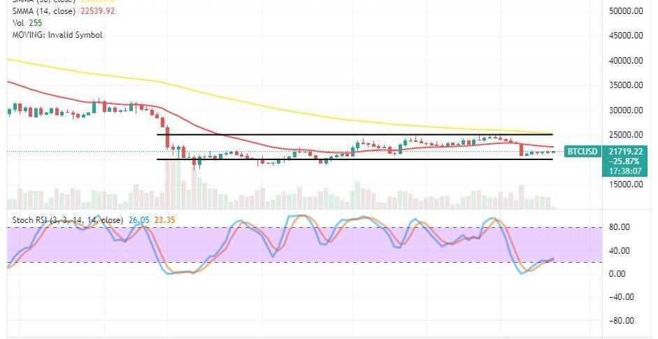 日线图BTC/USD日线图显示了加密货币市场在几个交易日内保持在25,000美元和20,000美元水平的范围内。在较低水平线的空间和较小的SMA的趋势线之间存在一系列较低的低点,具有看涨的交易前景。14天SMA指标在25,189.70美元下方为22,539.92美元。随机震荡指标已经越过南行,达到26.05和23.35区间点。