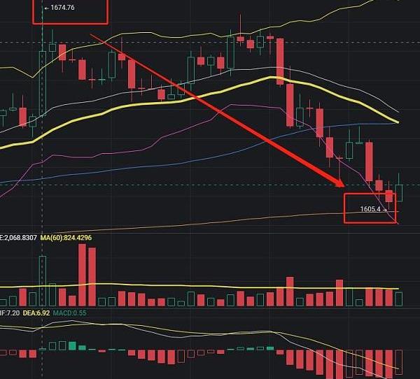 昨天以太坊从白盘的1691附近开始回踩,晚盘最低跌至1615附近开始反抽,涨至1706附近后有开始急速下跌,就在刚刚最低跌至1485附近反弹,现行情位于1515附近运行.