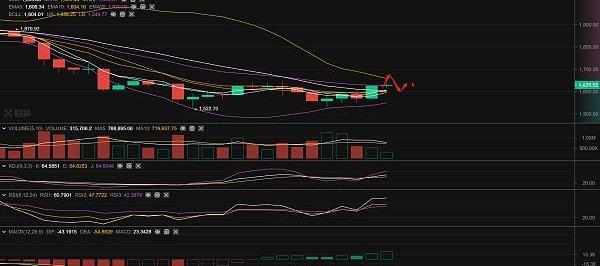 以太坊行情分析:从1小时线看,布林带开口向上,MACD绿色量柱放量,KDJ和RSI均开口向上,早间在中轨获得支撑后反弹,突破上轨支撑,4小时线,布林带缩口,MACD绿色量柱放量,KDJ开口向上,RSI有拐头的趋势,昨天行情跌至下轨附近获得支撑反弹,短期来看行情反弹受20日均线压制回踩,还有继续冲击上方压制的趋势,站稳1630支撑则有机会反弹1660附近的压制。