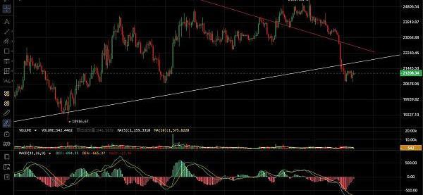 大盘昨日波动不大,处于大跌之后横盘整理阶段,加上周末原因交易量变小,走势也比较缓慢,昨日高位触及21350附近且多次触碰未能破位,凌晨空头发力连阴下行,破位前低来到20760一线,但未能走出延续形成双底止跌反弹,四小时来看行情处于低位震荡,多空都没有延续性,macd空头逐步缩量双线处于低位有拐头向上形成金叉的迹象,ma7均线同时拐头,目前关注能否站上ma7上方,四小时的形态来看有反弹需求,若突破21350下个位置关注21600,不过这种行情随时有可能下跌,破位20700将延续空头走势,日内思路建议反弹高空为主,上方压力21600-21900,下方支撑20000-19600