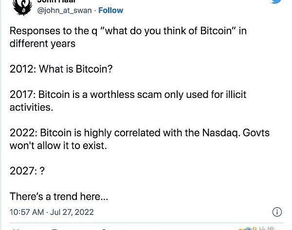 为了进一步支持传统金融尚未通过研究或理解得出他们对比特币的看法的观点,想想他们对比特币的共识意见在过去5到10年间发生了如此巨大的变化,但他们似乎甚至不承认这一点。