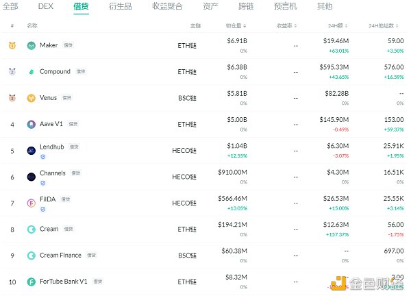锁仓量排名前十的借贷平台 排名来源:DeFibox