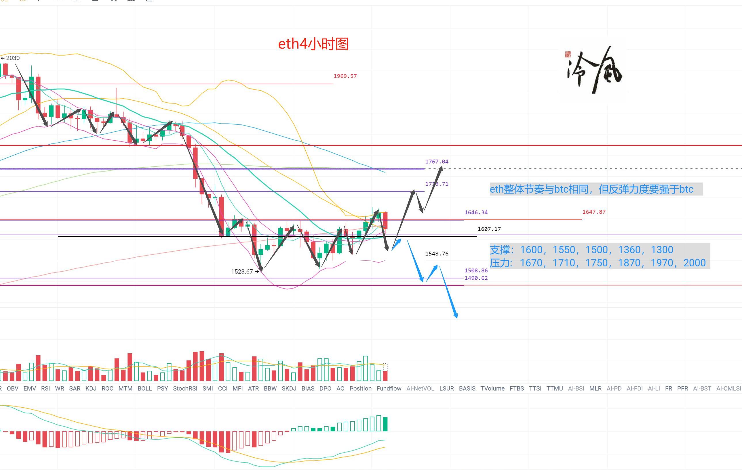 ETH短线支撑1560-1600美元,短线压力1700-1730美元。昨天早上已经提醒大家短线会有反弹,今天观点不变,但1700-1730美元一带压力较强会有反复。冷风认为随着以太2.0的临近,再出现趋势上涨的可能性不大,大家还是趁这次反弹把仓位减下来为好。