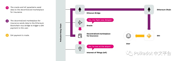 在你购买了航班延误保险的情况下,该政策的构建方式可能是:如果oracle平行链确认你的航班延误,而物联网平行链确认你是准时到达的机场,则该政策将支付赔偿金。在链上,如果保险平行链同时收到来自oracle和物联网平行链的信号,那么它就可以使用以太坊桥来触发使用稳定币(比如Dai)从保险公司账户到保单持有人账户的交易。这是互操作性强大的一个相对简单的例子。
