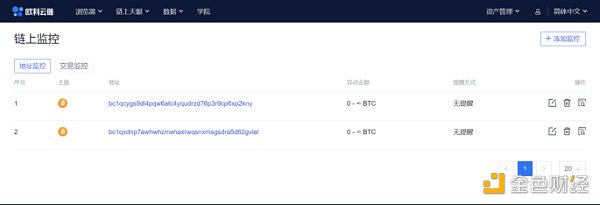 此外,欧科云链链上天眼还具有强大的链上监控功能。用户可以根据需求,设置 地址监控和交易监控,前者可以监控各类地址的动态,而后者则可以用来监控某笔交易中涉及到的资金。
