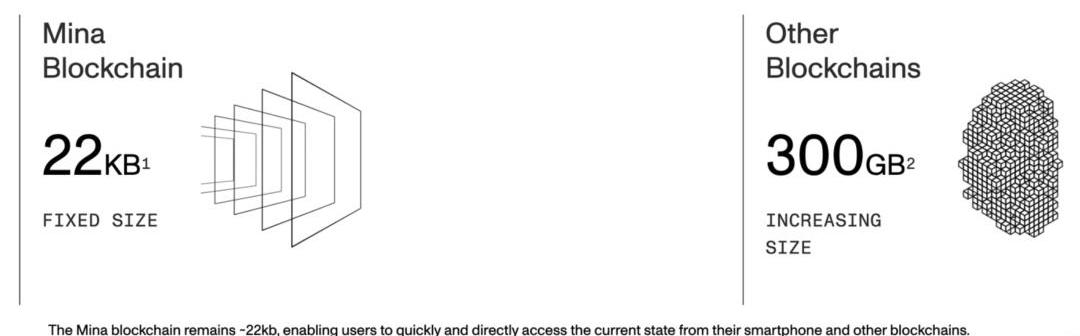 Mina的核心理念是「简洁的区块链」,整个Mina网络中处理的所有交易所占区块的大小都被限定在22KB。且最新的区块中会包含整个区块链的最新状态,用户只需一个zk-SNARK证明就可以在几毫秒内完全验证当前区块链的状态。