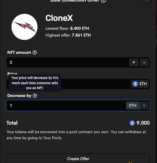 sudoAMM的系列报价其实也相当于创建NFT购买池,可以选择线性曲线或者指数曲线,与OpenSea等不同的是,由于sudoAMM是链上流动性协议,所以报价时所用的代币会被托管到用户拥有的池合约中,当然也可以随时从该合约中提款。