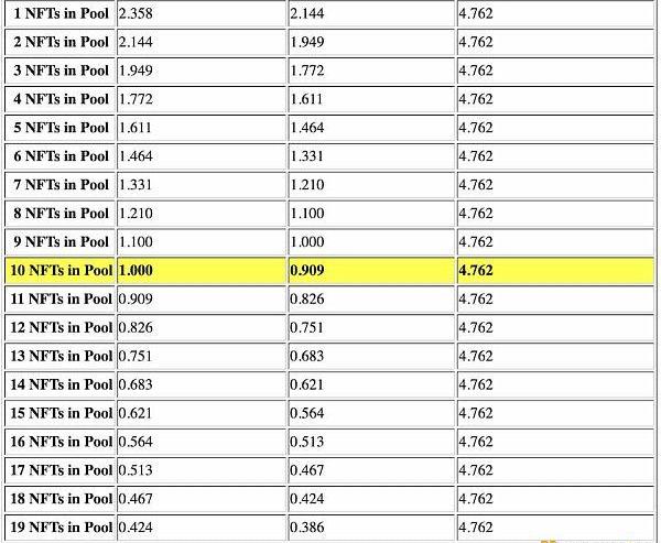 x*y=k池子中,交易者每购买或出售一个NFT时所需的ETH