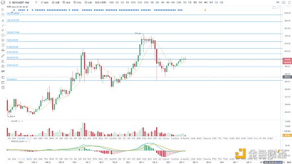 成交量较弱,小区间整理,放量突破30日均线压制线,上升空间才会拉大,支撑525美金。
