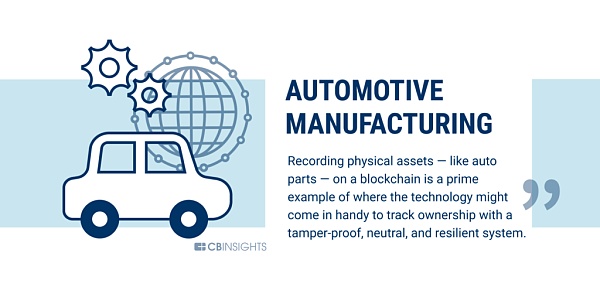 在区块链上记录实物资产也是其用例之一。区块链技术在汽车零部件供应链上取得了不错的进展。利用区块链技术可以轻松的建立防篡改并且中立的弹性系统来跟踪所有权。纸质记录容易被伪造或者被物理损毁,中央数据库可能会受到黑客攻击、人为错误和或篡改,但区块链是不可变的,没有一个实体可以控制账本。