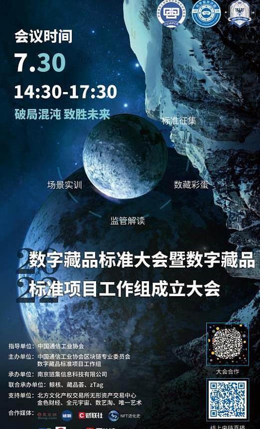 三.会议内容:为了更广泛吸纳社会各界意见,编制高质量的行业标准,推进区块链在数字收藏领域合规应用,促进数字藏品市场规范有序健康地发展,工作组拟定于2022年07月30日在线召开数字藏品标准大会暨“数字藏品标准项目工作组”成立大会。此次大会将邀请中国通信工业协会王秉科会长、中国通信工业协会区块链专委会轮值主席数标组首席专家朱幼平等领导专家出席,届时会有数十家数字藏品相关的专业机构就中国数字藏品的市场现状、监管现状、顶层设计、行业标准等方面做精彩的分享和互动,还将发布数字藏品标准大会纪念数藏。大会的内容精彩纷呈、数字领域大咖云集,主题突出、亮点繁多,欢迎各单位协办合作。