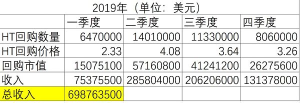 火币19年四季度的回购公告出来了,至此,2019年的收入情况咱们也大概能算出来了,狂人列个表: