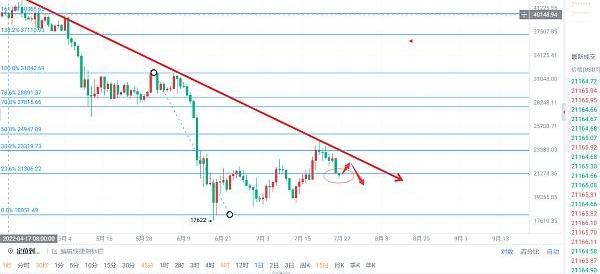 昨日日线K柱收了跟阴线底部在黄金分割线0.236的上方位置尝试性突破下方阻力,最终还是没有跌破这个位置,那么我们说下今日行情,今日在日线级别,K柱开盘在黄金0.236下方位置,但下方引较长,日线到达多空分水岭阶段。多头一但突破到这个21330黄金点,那么我们多头可以直接看到22800,如果在这个位置承压那么空头我们可以看到19400这个位置,也就是上次空头走出一波大行情之后的最低点跟次高这个位置。我们在看下小周期K线图,我们在黄金分割线短周期的一个高点拉到最低点,我们可以看到K线在0.236这个位子多头无力空头放量,MACD能量柱曾绿色状态,DIFDEA拐头朝下,综合这些指标,我们给出波段行情指示跟分析,目前21100-21400附近分批进场空单目标看19400-19500,行情在下跌的这个期间我们可以分批次止盈。