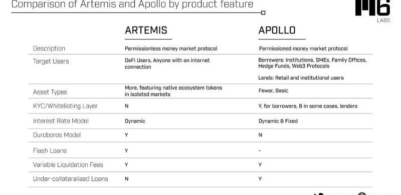 机构认证:机构认证过程分为链上和链下部分。与行业认可的服务提供商合作进行背景、信用和推荐人调查,构成了链外部分。与区块链上的服务提供商合作,处理白名单、托管和钱包跟踪分析服务,构成了链上部分。Apollo将采取"高度接触"和以客户为中心的方法。在认证前,一个专门的机构和合规团队将与机构接触,了解他们的产品需求和合规要求,提供认证指导,并与KYC/KYB服务提供商、托管人和白名单联络,以简化流程。存款/借贷:Apollo上的非许可资金池和许可资金池的关键区别在于,前者允许散户用户存款,而后者则只限于经过审查的贷款人。在这两种情况下,借款人都必须是通过KYB的,并由管理部门批准。池子里的存款人将收到相应的zToken,代表他们在池子里的份额和加班费,他们的余额将根据所得利息增加。借款:只有KYB过的机构和/或参与者才可以成为借款人。每个借款人能够创建他们自己的池子或参与一个开放的池子。每个池子都会有不同的借款条件,包括期限、可选择性和抵押率,这些因素都会导致各个池子的利率不同。现在我们已经介绍了zkLend这两种工具的基本特点,接下来让我们看看?Artemis和Apollo的主要区别,如下图所示: