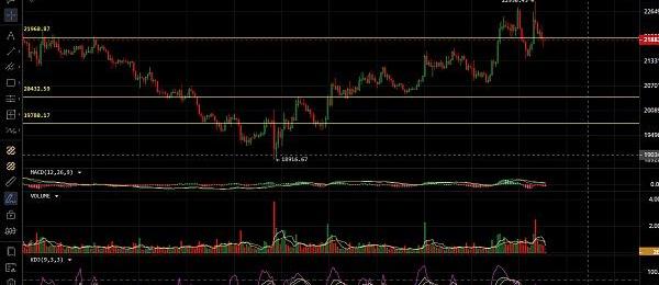 大饼昨日走势完美验证思路,横盘后再次拉升,高位触及22950附近,恭喜跟上昨日多单的朋友,完美到达第二止盈获利1200点,日线级别上方压制较强,形成双顶形态走出回落,macd多头无量运行,kdj三线死叉向下,此轮上涨行情已处于尾端,趋势多单可以逐步止盈,思路上建议高空为主,22500-23000空,目标21500-21000