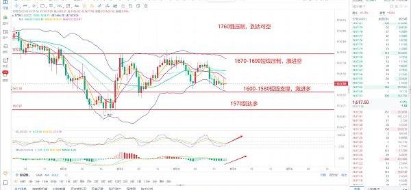 以太坊的行情同比特币也是大差不差,日K有一定的触底迹象,之前的布林中轨是上移到了1570附近,目前行情重点关注1600~1670这个区间的下沿支撑情况,今天思路也是给出上下方的两个支撑和压制,第一压力位1670,第二压力位1760,第1支撑位1600,第2支撑位1570,在区间之内高估低渣即可。